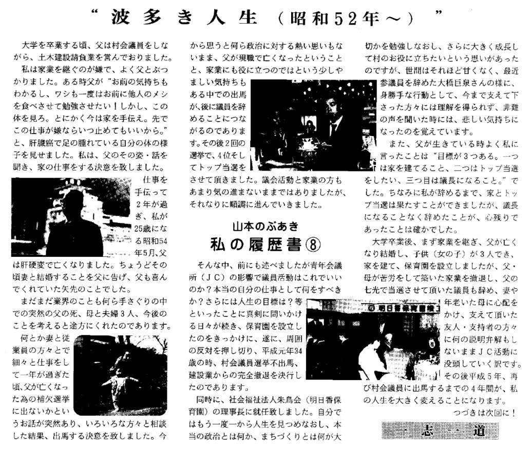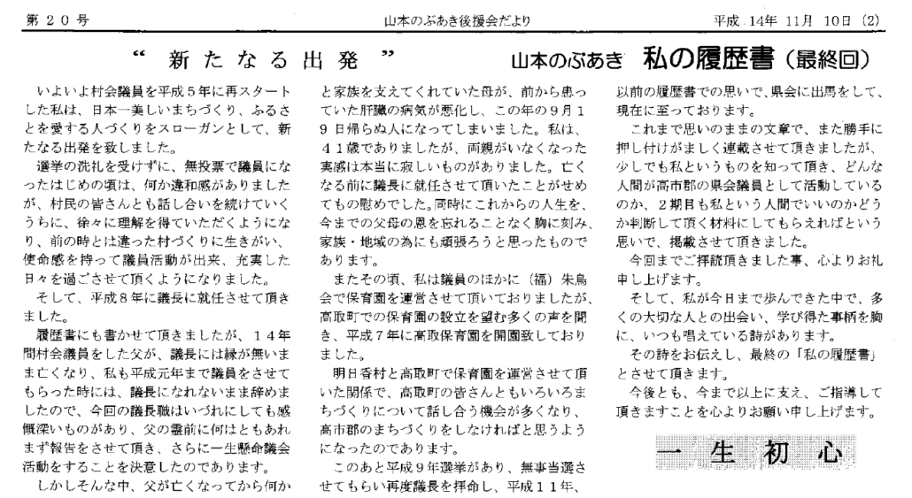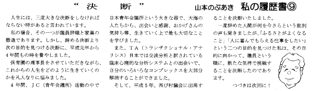 そして、平成5年、再び村議会に出馬することを決断いたしました。