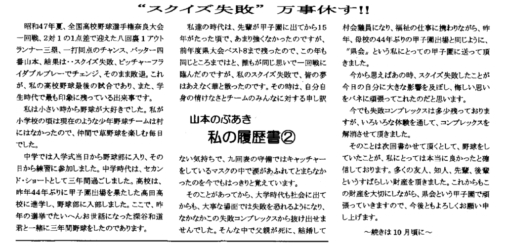 今、県会に出させて頂き、多くの野球をやっていた仲間や、すばらしい先輩諸兄、野球を通じてっちかった人間関係に、支えられていることに、心からの感謝をこの紙面を借りて御礼を申し上げたいと思います。