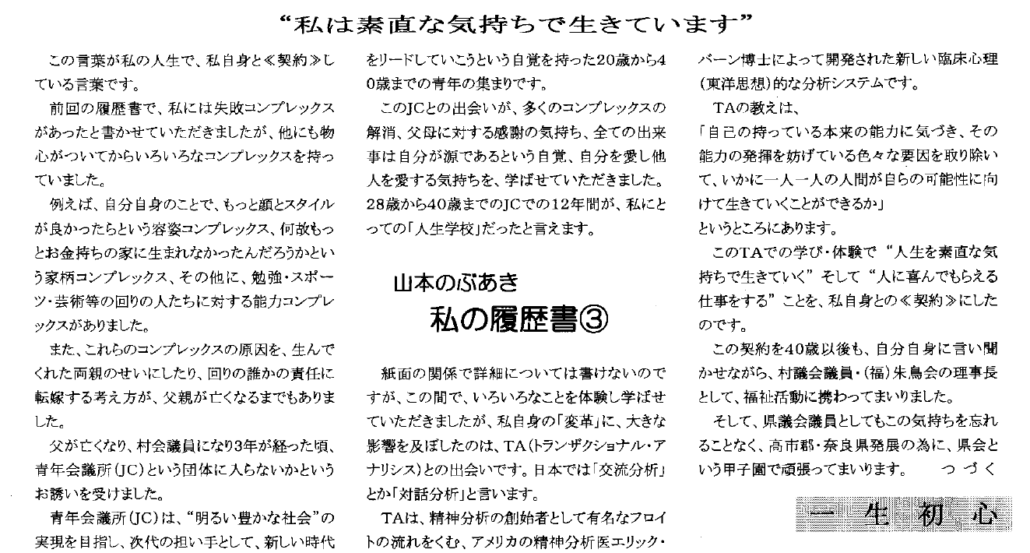 これまで思いのままの文章で、また勝手に押し付けがましく連載させて頂きましたが、少しでも私というものを知って頂き、どんな人間が高市郡の県会議員として活動しているのか、2期目も私という人間でいいのかどうか判断して頂く材料にしてもらえればという思いで、掲載させて頂きました。