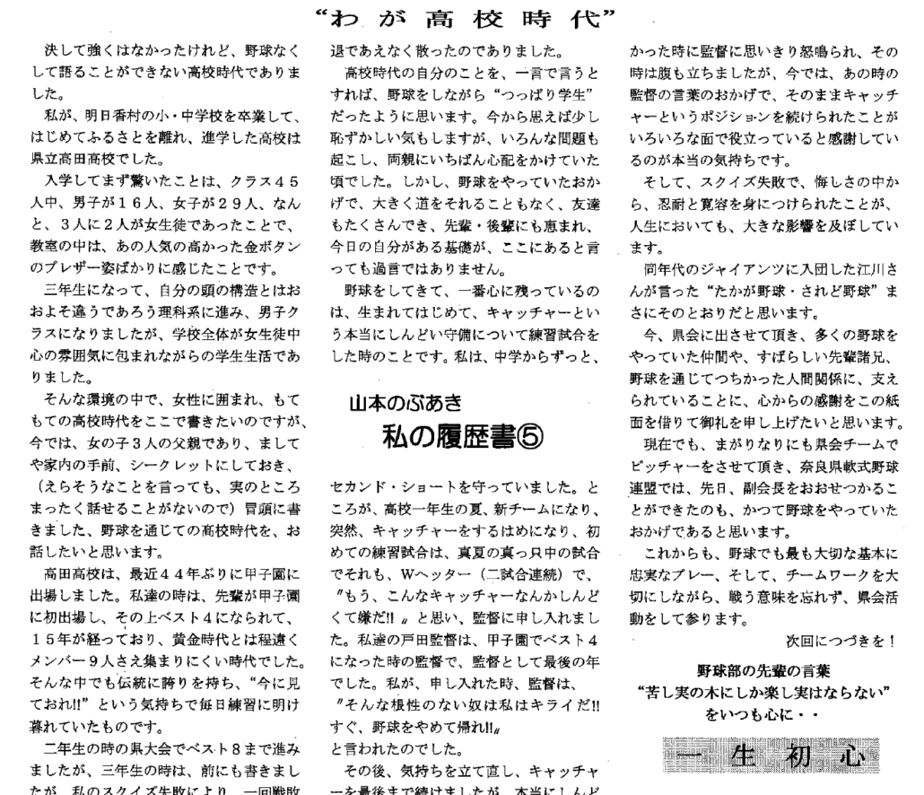 現在でも、まがりなりにも県会チームでピッチャーをさせて頂き、奈良県軟式野球連盟では、先日、副会長をおおせつかることができたのも、かつて野球をやっていたおかげであると思います。