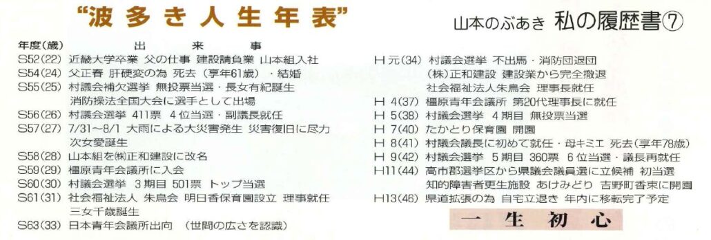 この契約を40歳以後も、自分自身に言い聞かせながら、村議会議員・(福)朱鳥会の理事長として、福祉活動に携わってまいりました。